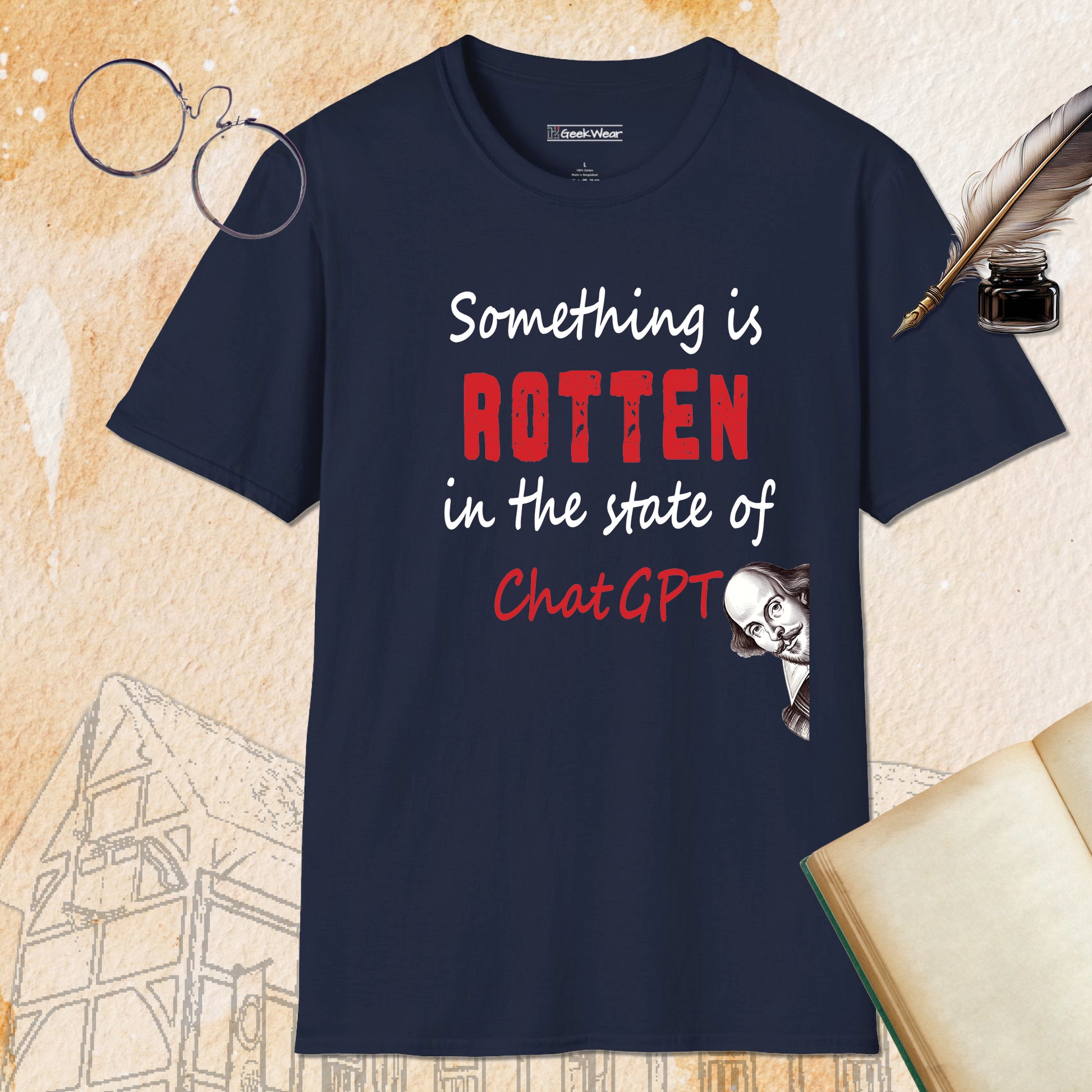 A geeky and Shakespeare themed T-Shirt that brings together the best of both worlds. Perfect for the literature enthusiast or anyone looking to add a unique touch to their wardrobe. Ideal for casual wear, gift giving, and special occasions like literary events or Shakespeare's birthday.
